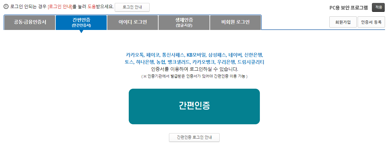● 간편인증 로그인(카카오, 네이버, 토스, 드림인증, 통신사 PASS, 국민인증서, 삼성패스, 하나인증서, 카카오뱅크, 페이코, 우리인증서, 신한인증서, 뱅크샐러드)
