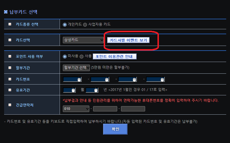 - 아래에 카드사별 이벤트 보기를 누르시면 카드사별 자세히 보기를 클릭하시면 무이자 할부 혜택을 확인하고 선택하세요.