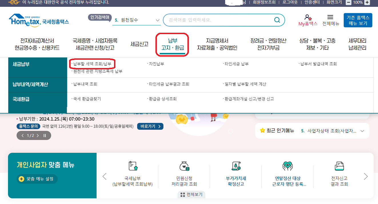 3. 홈택스 메뉴에서 납부 고지 환급에서 납부할 세액 조회/납부를 클릭합니다.