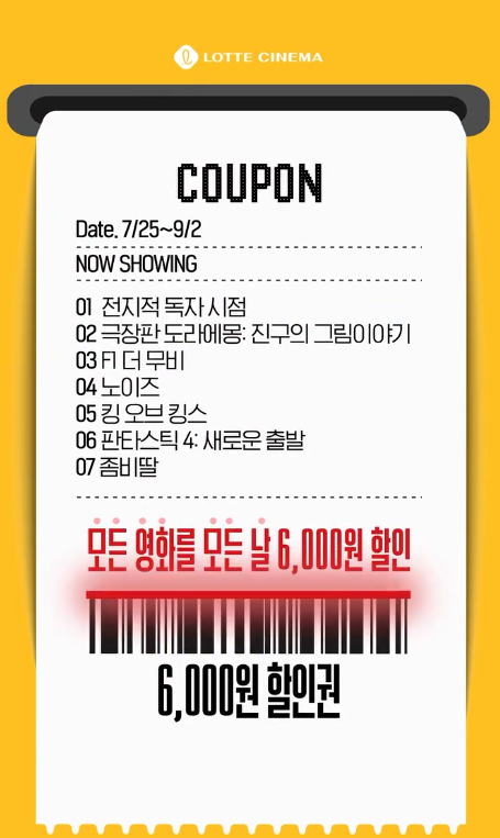 관련 태그: #영화할인 #영화할인권 #6000원할인 #영화표할인 #CGV #롯데시네마 #메가박스 #영화진흥위원회 #문화생활 #극장할인 #할인정보